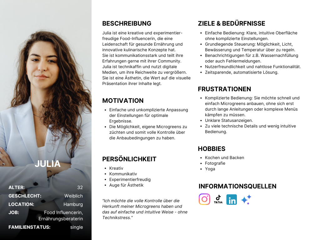 To better understand the different usage contexts of the Mana Cube, I developed two primary personas – Julia representing private users and Michael representing commercial operators.